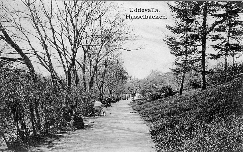 Tryckt text på vykortets framsida: "Uddevalla. Hasselbacken".