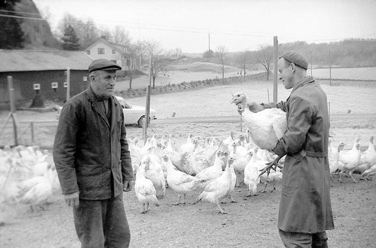 Enligt fotografens notering: "Kalkonuppfödning. Wilhelm och Karl-Eric Karlsson, Svenny Kungshamn ".