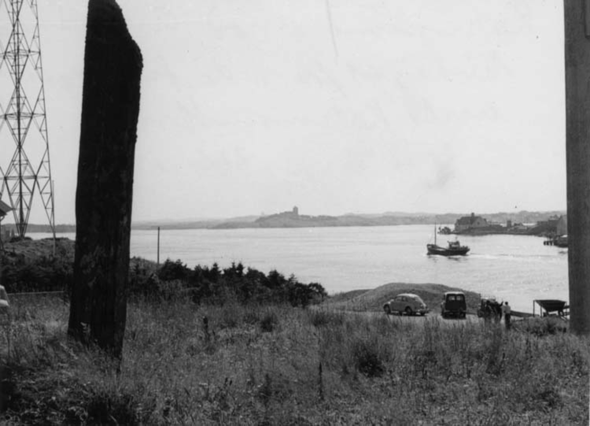 Skrivet på baksidan: Karmsund med Avaldsnes kirke, sett från "de fem söstre" under Karmsundsbron 22/8 1967