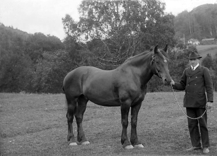 Enligt noteringar: "En man i hatt och slips står och håller en svart häst i en töm. De står ute på ett fält som gränsar till en lövskog. Längre bort i sluttningen skymtar en gård, vilken ligger på Krokklev. (Tidigare ägare: Hedén)." (BJ)
