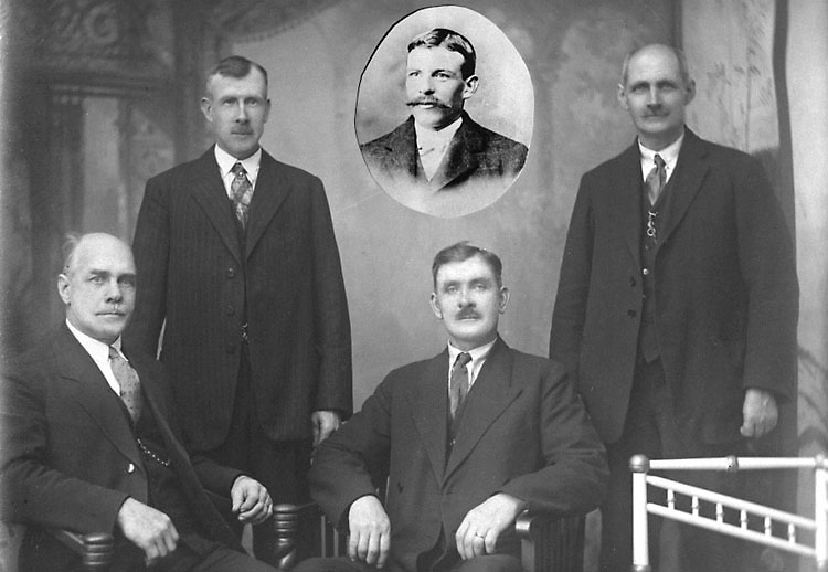 Konsums styrelse i Munkedal. De två stående männen är från v. Nils Andersson, Bajan och Johannes Kolliander, Stale. Sittande Gustav Lundin och Karl Siversson." (BJ)