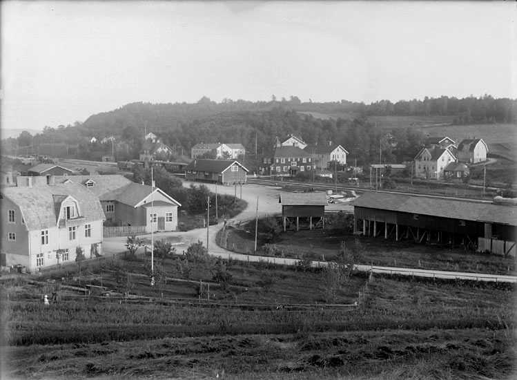 Vägsträckningen är den gamla, före vägportens tillkomst. Posthuset mellan Hansson affär och järnvägshotellet är ännu inte byggt (byggår 1933)." (BJ)