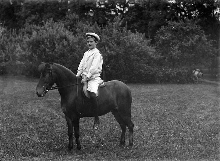 Enligt noteringar: "Pojke på hästryggen, troligen någon av barnen Leuhusen, som gästade familjen Sörensen varje sommar under många år." (BJ)