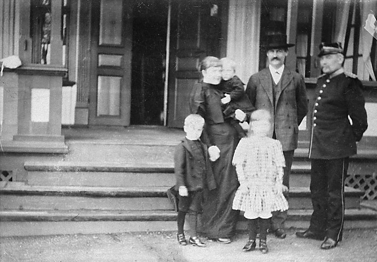 Enligt senare noteringar: "Grupp personer utanför veranda. Personerna okända, en man i militäruniform." (BJ)