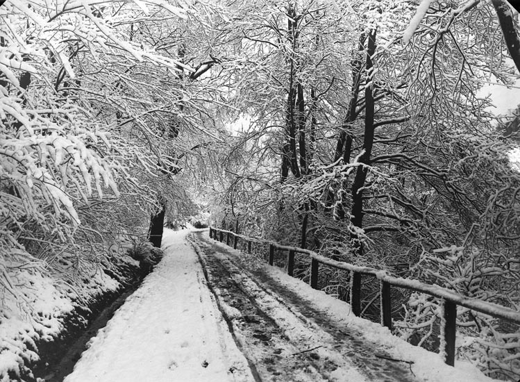 Enligt fotografens noteringar: "Snöbild vid gamla Smedbruket i Munkedal."