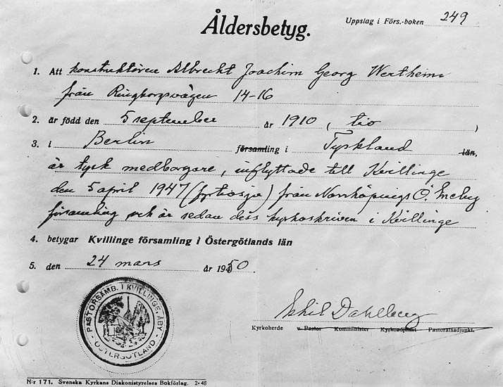 Enligt fotografens journal nr 8 1951-1957: "Wertheim, Ingeniör, Stenungsund kopia av åldersbetyg".