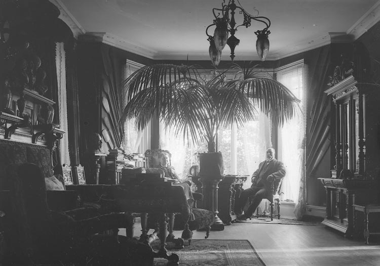 Interiör som avbildar herr och fru Sundberg i hemmet på Stenungs gård