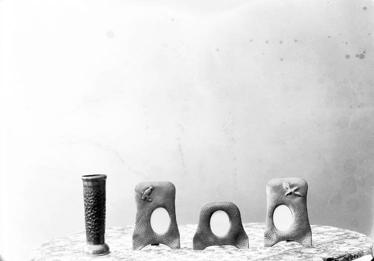 Enligt fotografens notering: "Vas och ramar i hamrad metall".