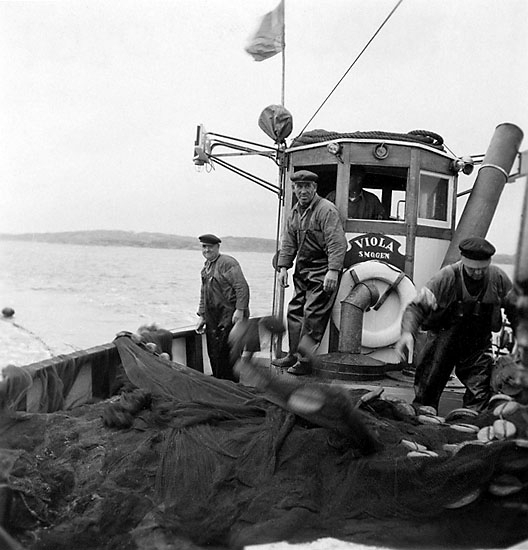 Arbetsbild, Viola - Smögen, vaden går. Fr.v.: Albert Amandusson, Sven Stenman, Knut Andersson (i hytten), Lars Andersson.