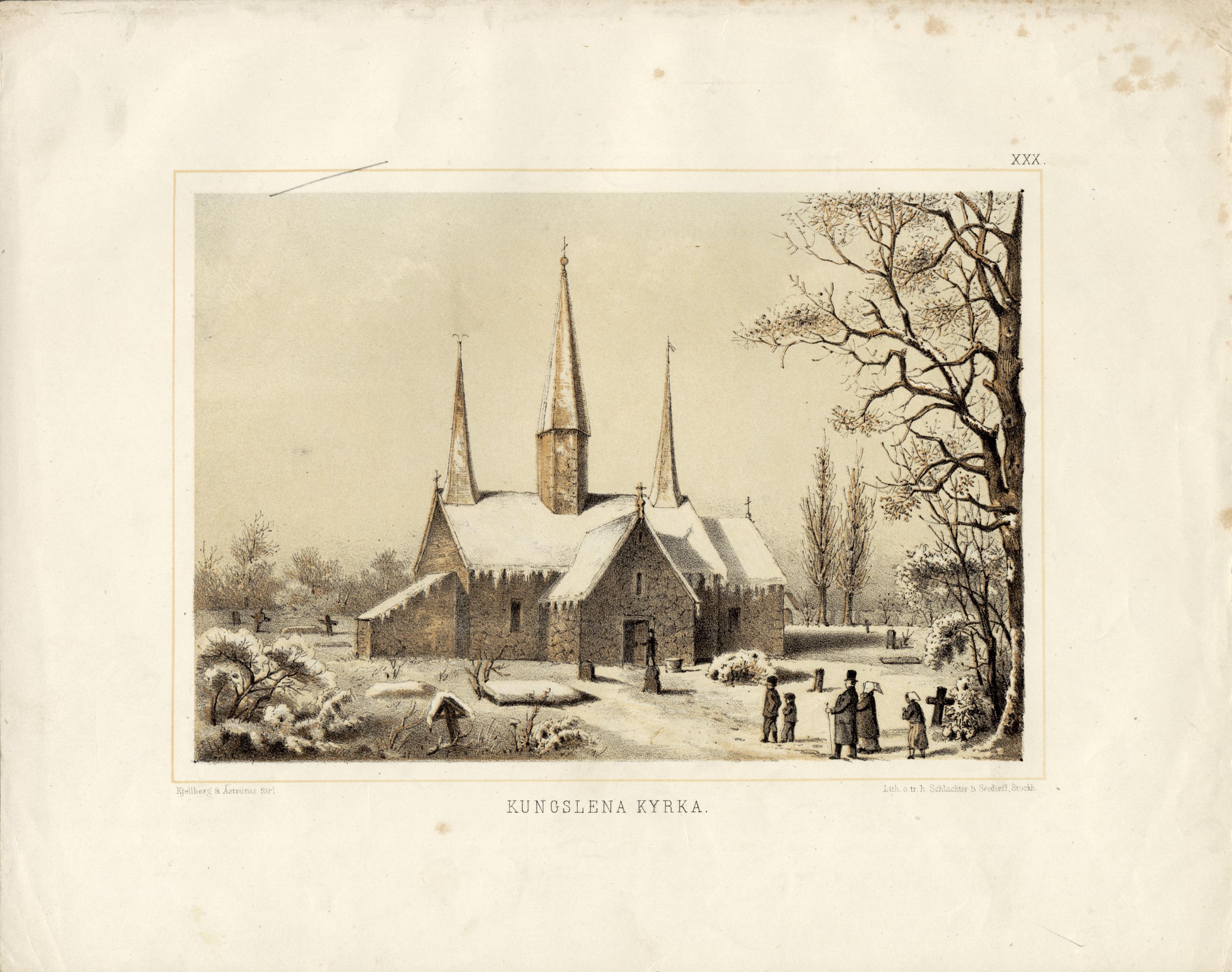 Kyrkan från sydväst. Litografi ur "Märkligare Svenska kyrkor" 1874.
