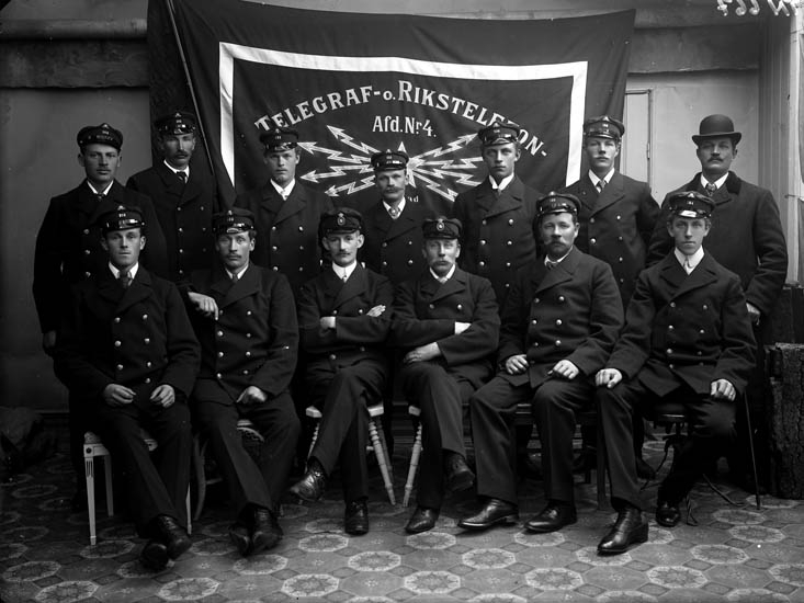 Enligt tidigare noteringar: "Ateljéfoto av grupp telegrafarbetare, med fana. Telegraf o Rikstelefon avd. nr. 4."