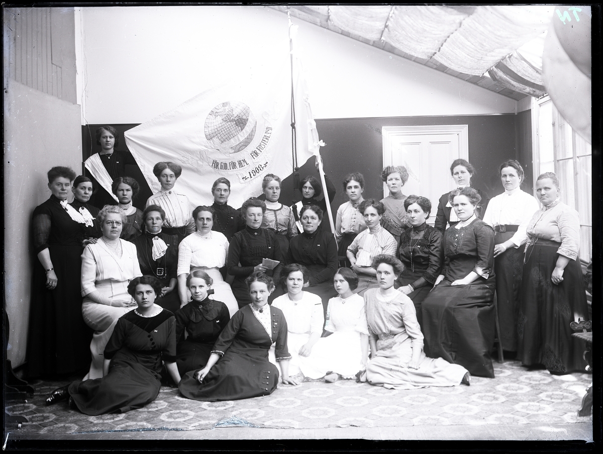 Vita Bandets medlemmar i Uddevalla. I bakgrunden syns föreningens fana med devisen "För Gud, För Hem, För Fosterland". Två av kvinnorna i bilden har också vita band över bröstet vilket var föreningens symbol