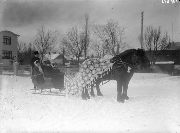 "Privatfamilj på slädfärd efter parhästar på Södertullsgatan, Uddevalla."