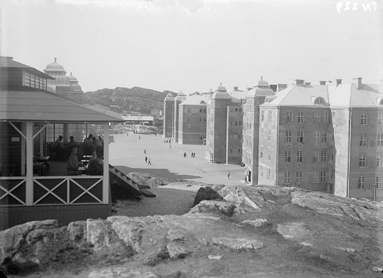 "Bohusläns regemente, Kasernerna och kaserngården från "Musikberget", "Verandan" gamla marketenteriet." Uddevalla.