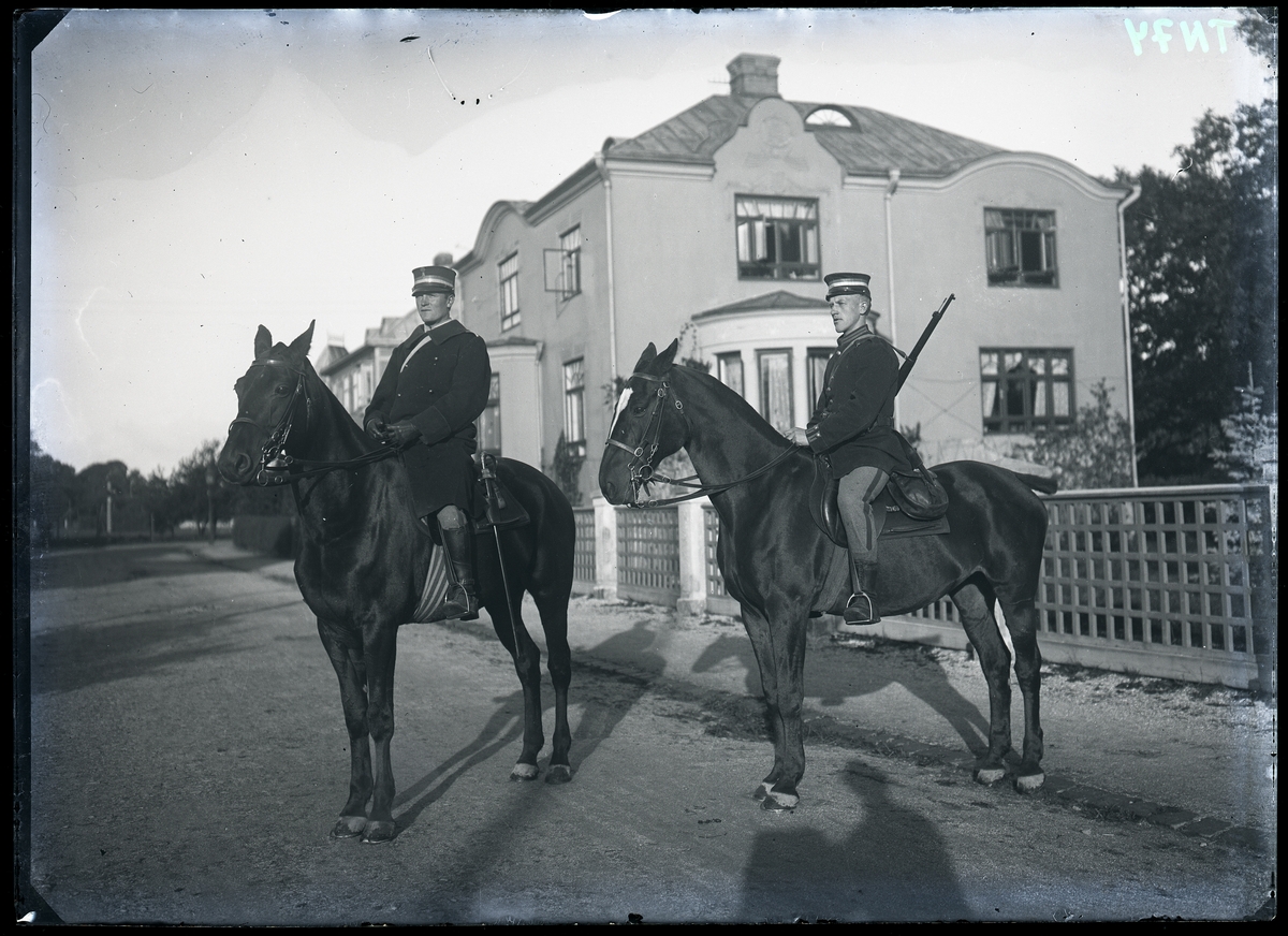 Enligt senare noteringar: "Två ryttare, militärer, stridsdomare och ordonnans framför bostadshus."