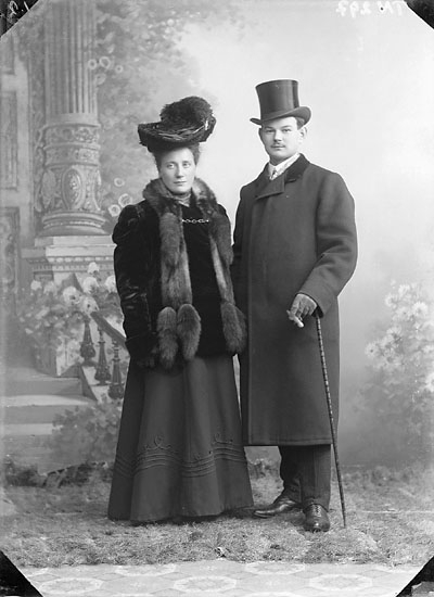 Enligt senare noteringar: "Ateljéfoto av en man och en kvinna, klädda i eleganta ytterkläder. Mannen med hög hatt och käpp, kvinnan med boa. Barberare Brylla med fam."