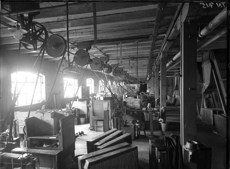 Enligt tidigare noteringar: "Interiör från Uddevalla Tändsticksfabrik. Asktillverkningssal, Spånsvarvar och sticksvarvar."
