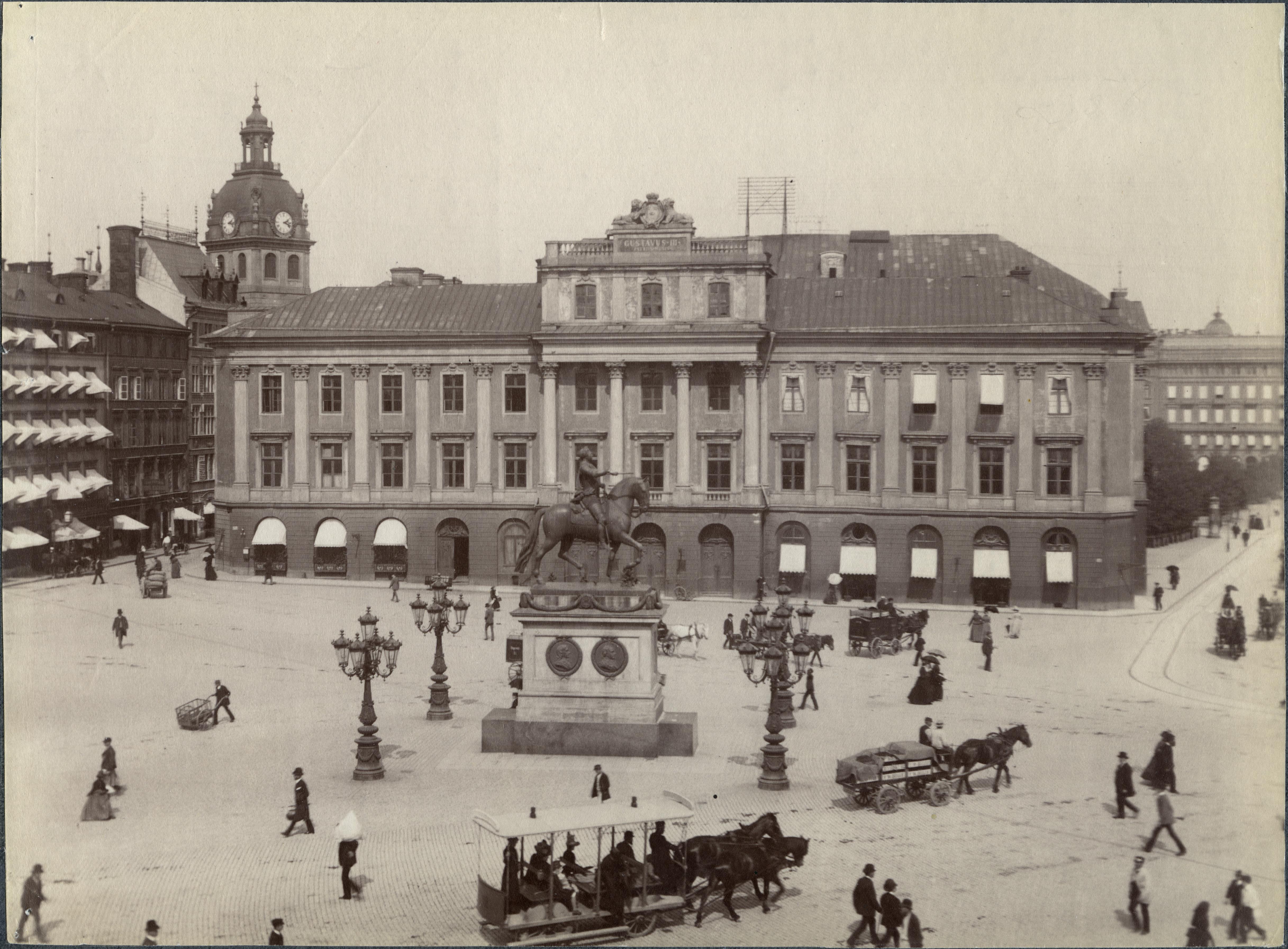 Operahuset från 1782 revs 1892 och ersattes 1898 av det nuvarande Operahuset på samma plats vid Gustav Adolfs torg. Till vänster syns tornet till Jakobs kyrka.