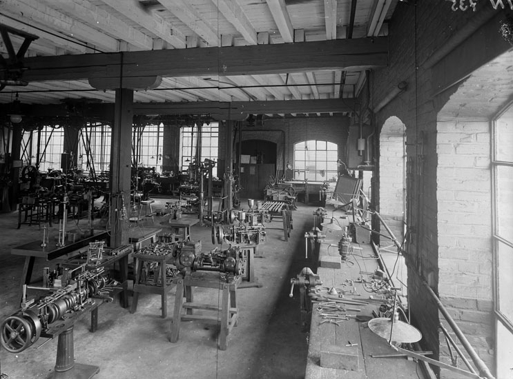Enligt tidigare noteringar: "Interiör från Uddevalla Tändsticksfabrik. Maskin-repartionsavdelning. "