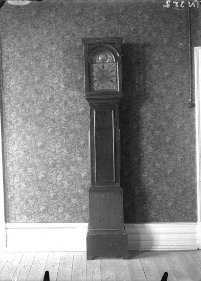Enligt tidigare noteringar: "Golvklocka, stående framför vägg med storblommig tapet i troligen omöblerat rum."