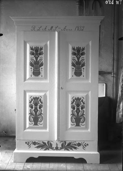Enligt tidigare noteringar: "Skåp, nymålat märkt R.L.A. M S Anno 1932."