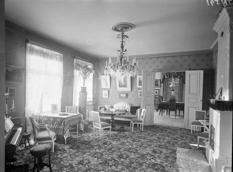 Enligt tidigare noteringar: "Interiör, salong i ett privathem, kakelugn, piano, ljuskrona och salongsmöbel."