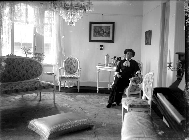 Enligt tidigare noteringar: "Interiör från salong, dam sittande i stol."