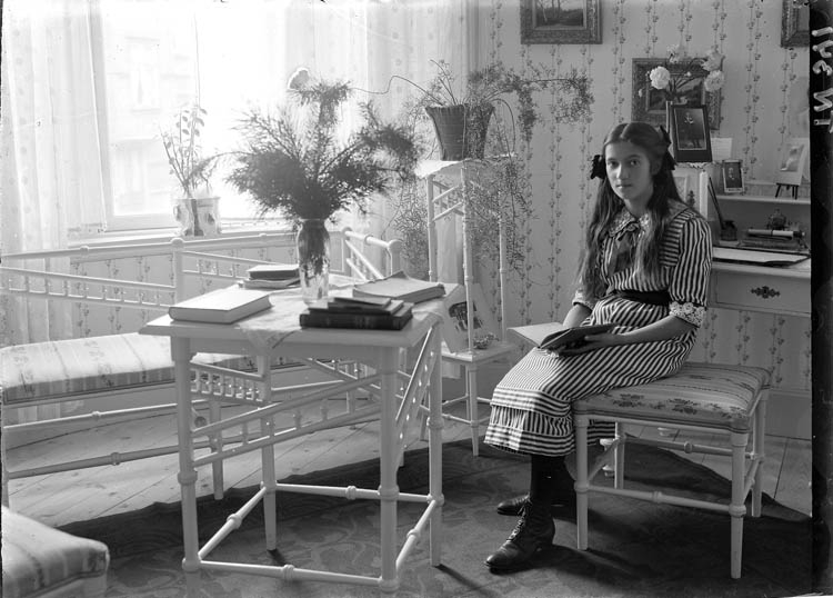 "Ung flicka i privat hem". Flickan på bilden är fru Maja Källner, född Radyn, möblerna finns 1977 i villa Majsol på Gustafsberg." enligt notering.