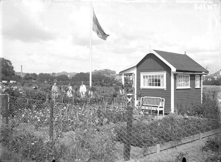 "Kolonistuga på ängarna söder om Walkesborg, Uddevalla. Trädgård med blommor och flaggstång"