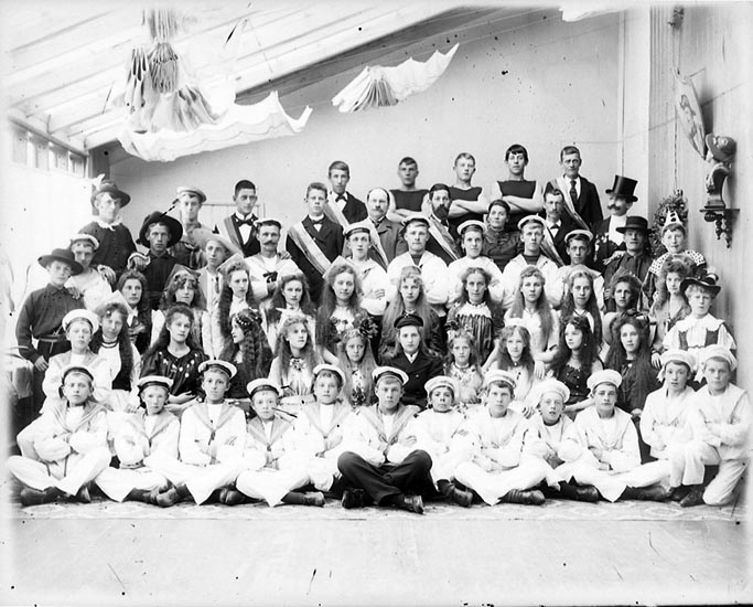 "Ateljéfoto av medlemmar i nykterhetsloge, klädda till kostymfest. A. Hansson fotoateljé som Thure Nihlén övertog 1906."