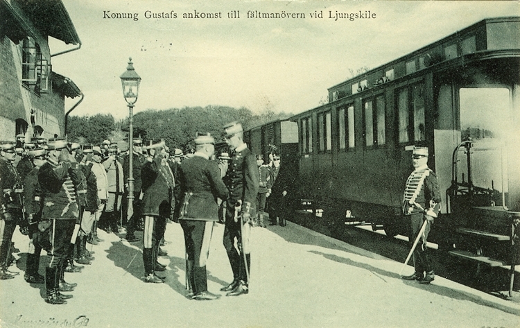 Enligt Bengt Lundins noteringar: " Konung Gustafs ankomst till fältmanövern vid Ljungskile".