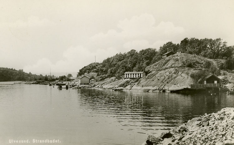 Enligt Bengt Lundins noteringar: "Ulvesund. Strandbadet bad och båthus".