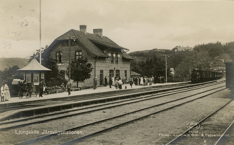 Enligt Bengt Lundins noteringar: "Ljungskile. Järnvägsstation med kiosk, folk och tåg".