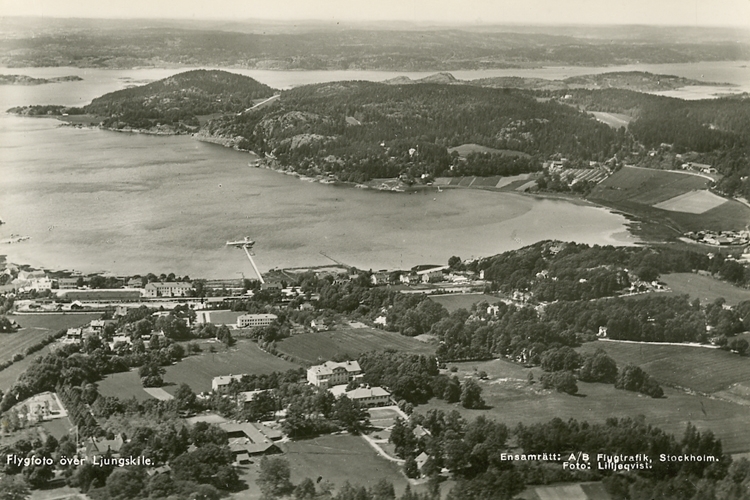 Enligt Bengt Lundins noteringar: "Flygfoto över Ljungskile. Med berg".