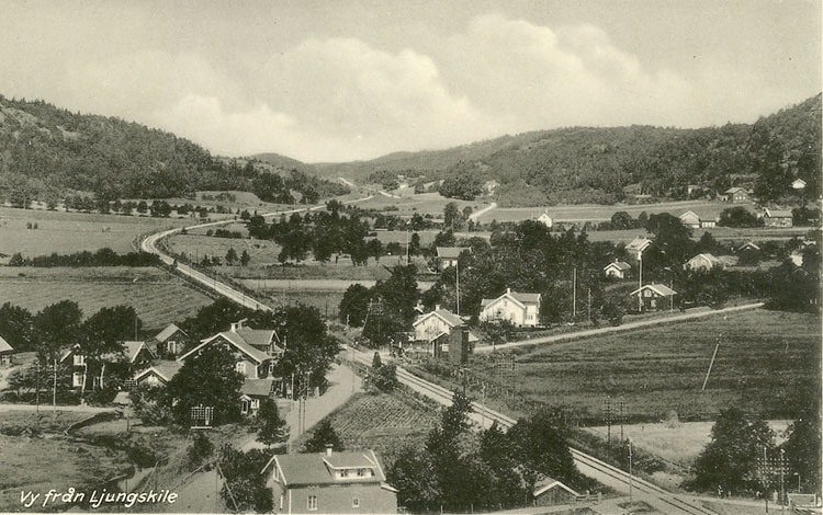 Enligt Bengt Lundins noteringar: "Järnvägen och järnvägskorsning. Vy från Ljungskile".