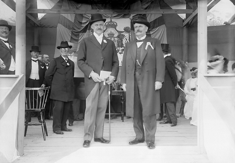 Enligt tidigare notering: "Hederstribunen på Margretegärde vid jubileumslantbruksmötet 1914. Till vänster jordbruksministern Friherre Johan Beck-Friis, född 1862. Till höger Landshövdingen Friherre Gustaf Lagerbring, född 1847, död 1921".