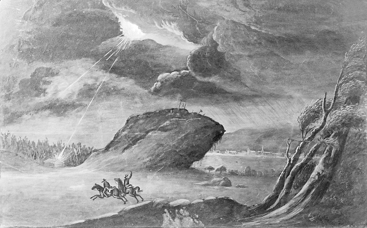Enligt tidigare notering: "Avfotografering av målning, signerad R W W 1827. Motiv dramatisk landskap med åskväder, ryttare i förgrunden. Tillhörande fru Bildt, Kårehogen."