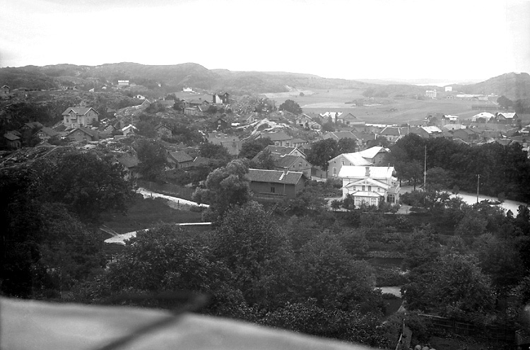 Enligt tidigare notering: "Vy från Uddevalla klocktorn mot sydväst, över kvarteren Dyrehaven och Wägge m.m. I förgrunden syns den s.k. Bildtska villan med sin trädgård."