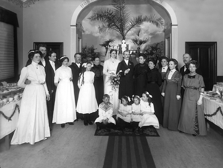 Enligt tidigare notering: "Brudpar med tärnor och bröllopsgäster i Betelkapellet Uddevalla." brudpar.