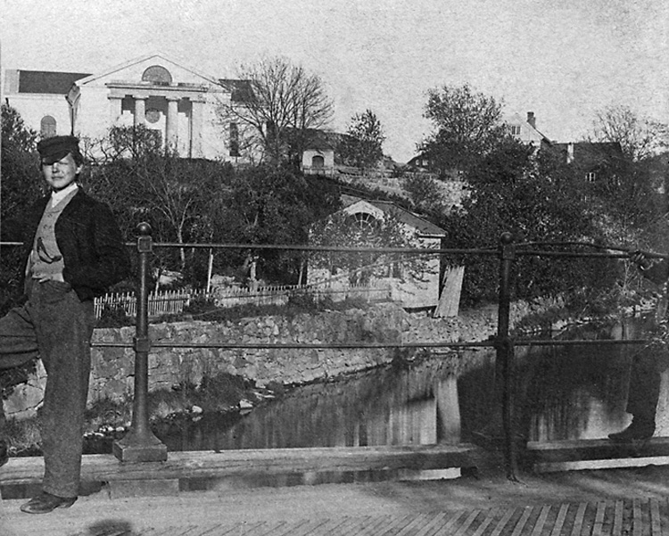 Enligt tidigare noteringar: "Kyrkan fotograferad från träbron, yngling på bro."
