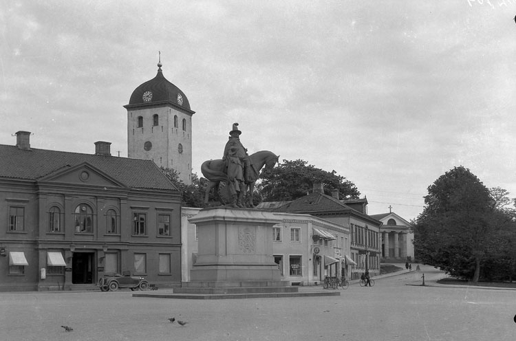 Uppgift enligt fotografen: "Uddevalla. Kungstorget m statyn."