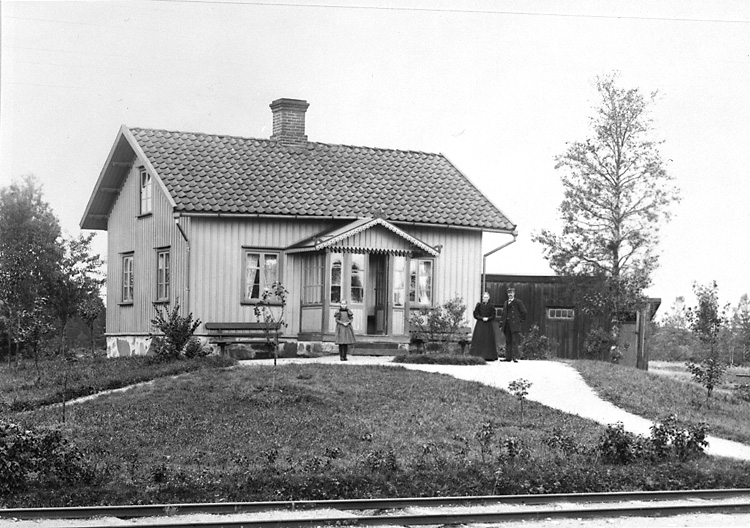 Enligt tidigare notering: "Banvaktsstuga invid ULB järnvägen. Framför huset järnvägstjänsteman, kvinna och flicka."