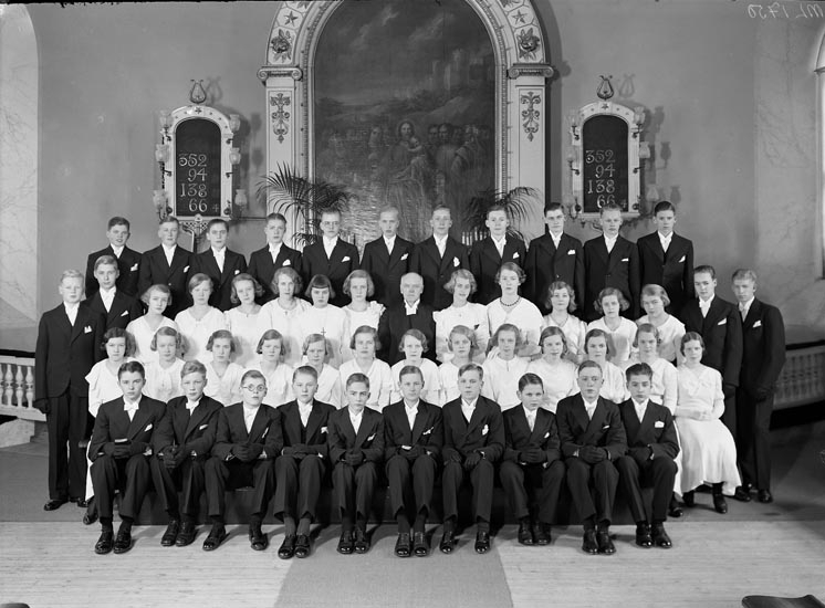 Uppgift enligt fotografen: "Uddevalla. Konfirmander stor grupp. Pastor Agner."