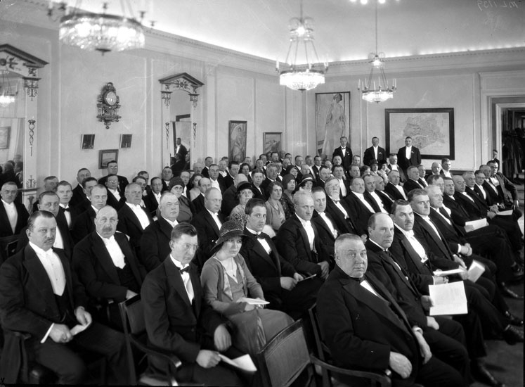Uppgift enligt fotografen: "Uddevalla. U-a Köpmannafören. Årsmöte stadsfullmäktige Sessionsalen."