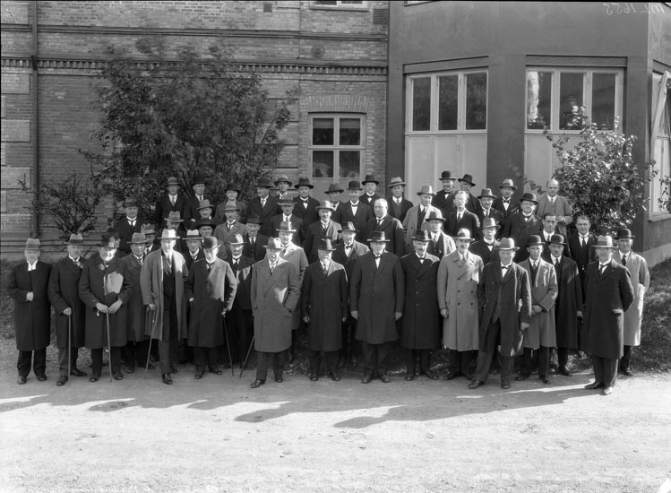 Uppgift enligt fotografen: "Landstinget på besök. Grupp framför byggnad."