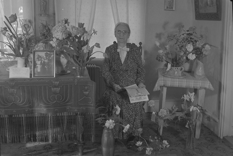 Text till bilden: "Fru Rasén, Landsvägsgatan 12. 85 år. 1950.05.05"