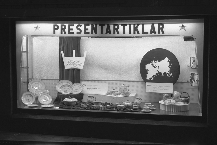 Text till bilden: "B. Erikssons Bosättningsaffär. Rörstrands fönster.1953"