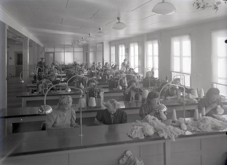 Text till bilden:"Strumpfabriken. Tillverkning av strumpor".