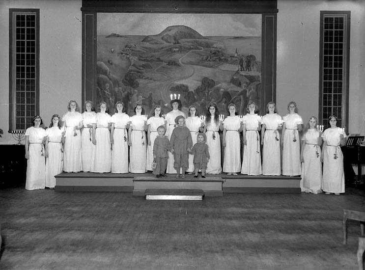 "Lucia med sina tärnor och tre tomtar. 1939"
