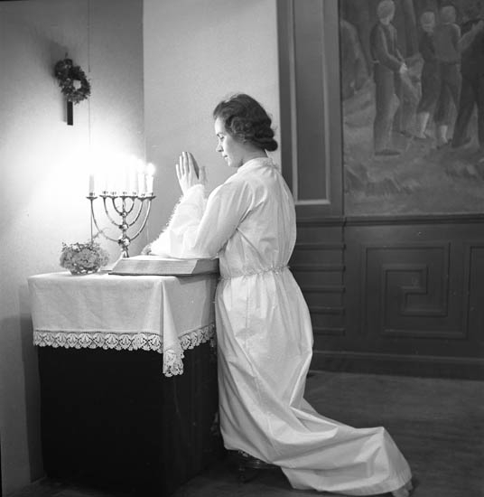 "Lucia utan krona vid altaret. V. U. Skolan".